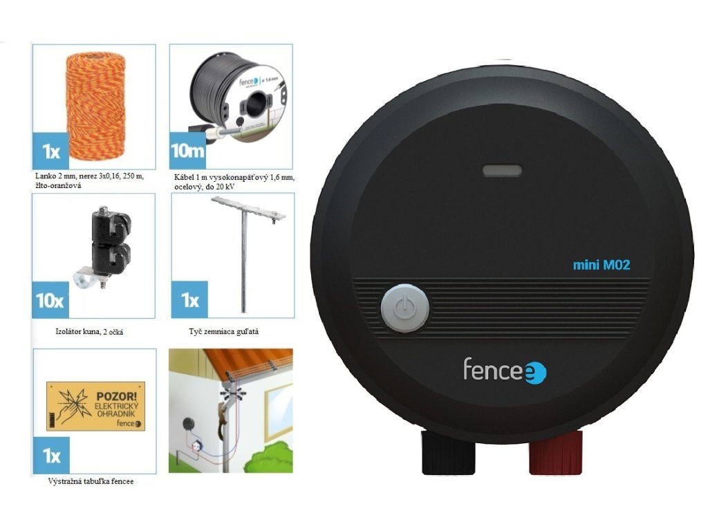 Speciální kompletní sada určená pro ochranu pozemku, např. jezírek nebo budov před nežádoucími návštěvníky jako jsou vydry, kuny, zajíci a jiná malá zvířata. Tímto elektrickým ohradníkem omezíte přístup až do 250 m obvodu a výška ohrazení až 86 cm. Pro zajištění maximální ochrany doporučujeme speciální souběžné vedení drátů způsobem PLUS MINUS, čímž zajistíte prostor o obvodu až 125 m. Základem je generátor fencee Mini M02, který je univerzálně použitelný pro krátké až středně dlouhé ohrady a především pro citlivější zvířata jako jsou psi a kočky a jako ochrana proti drobným predátorů. Kompaktní moderní konstrukce ohradníku s vypínačem a nejnovější mikroprocesorovou technologií uvnitř nabízí praktické řešení a umožňuje jednoduchou instalaci. LED kontrolka na přední straně signalizuje provoz zdroje.